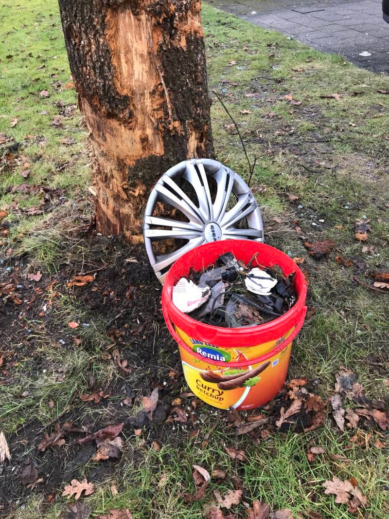 Restanten van een eenzijdig ongeluk waarbij de auto op 21 december 2025 frontaal tegen een boom reed. Dit afval lag er nog op 10 januari 2026