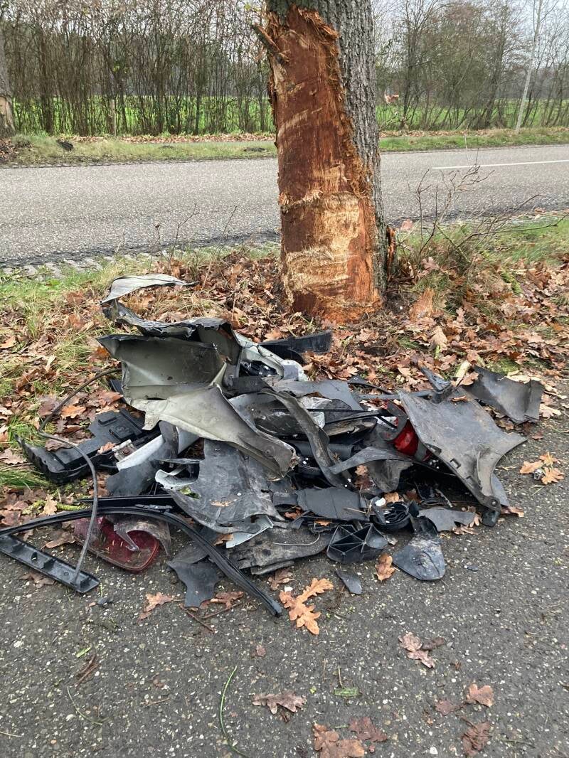 Wederom ging het fout op de Barneveldsestraat van Renswoude, ditmaal op 12 december 2025. Auto schampte deze boom en belandde daarna achterstevoren in de greppel. Links boven op de stapel ligt het verfrommelde linkerspatscherm met TSI erop, dus waarschijnlijk een VW geweest.