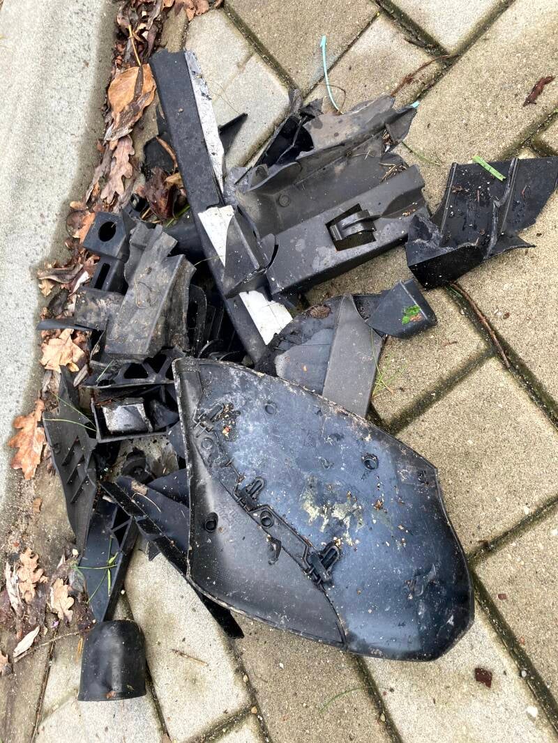 Brokstukken van een VW Passat na een eenzijdig ongeluk op de Zelderseweg in Nijkerk (N301) waarbij de achteras was losgebroken en de auto op zijn dak eindigde. Nu ook in de struiken langs het fietspad het nodige gevonden.